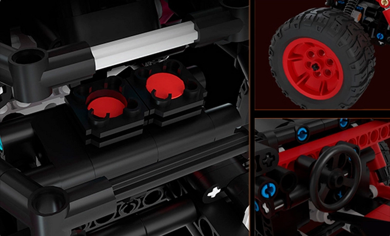 Игрушка знакомит ребенка с азами механики. Вместе с движением колес приходит в движение поршневой двигатель. Большие протекторы и амортизированные мосты позволяют вездеходу преодолевать сложные ландшафты.