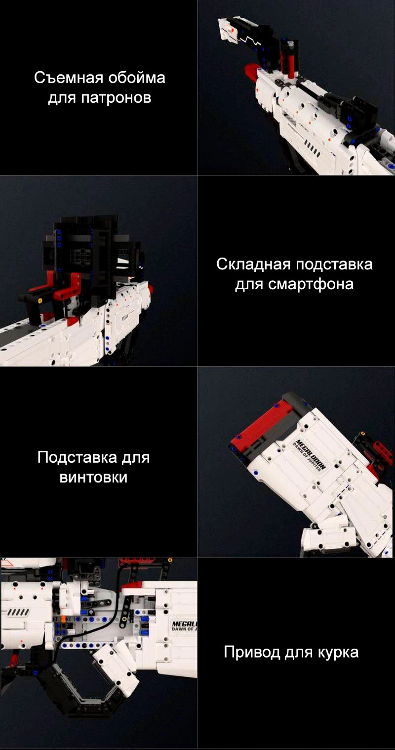 В конструкторе представлено большое количество рычажных механических конструкций, которые знакомят ребенка с основами физической механики в процессе сборки винтовки.