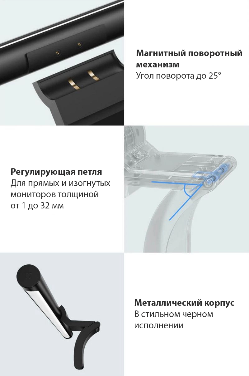 Лампа легко устанавливается на любой монитор толщиной до 32 мм. После установки можно вручную отрегулировать угол наклона светильника. Mijia Display Lamp экономит место на рабочем столе и дает достаточно освещения для выполнения рабочих задач. Не рекомендуется использовать лампу с ноутбуками.