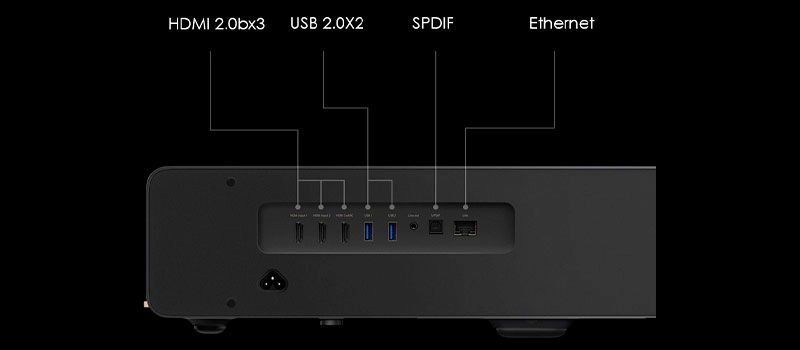 Xiaomi Mijia Laser Cinema 2 оснащен тремя портами HDMI, двумя USB, SPDIF интерфейсом и портом для подключения Ethernet. Вы можете подключить к проектору жесткий диск с 4K фильмами, игровую консоль, флешку, тв-приставку, ноутбук и другую технику.