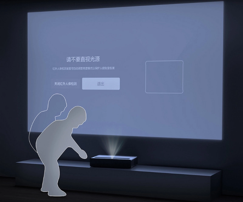 По обе стороны от объектива находятся специальные датчики, которые могут распознать приближение человека и снизить яркость проектора до минимума для того, что защитить глаза от попадания яркого света. Проекционное изображение формируется через отражение света и не создает дополнительной нагрузки для глаз.