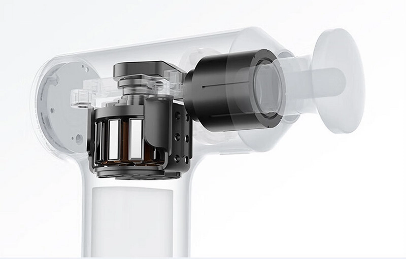 Перкуссионный массажер проминает мышцы с силой до 12 кг (190 мН/м). Он оснащен двигателем мощностью 58 Вт, который вращается со скоростью 2500 об/мин и проминает мышцы и фасции на глубину до 6 мм.