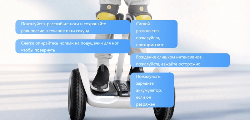 Голосовой ассистент громко сообщит о необходимости поправить позу или сбросить скорость, напомнит о предельной мощности, низком заряде батареи или сигнализирует о неисправности.