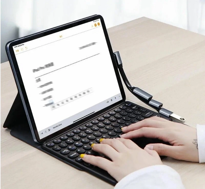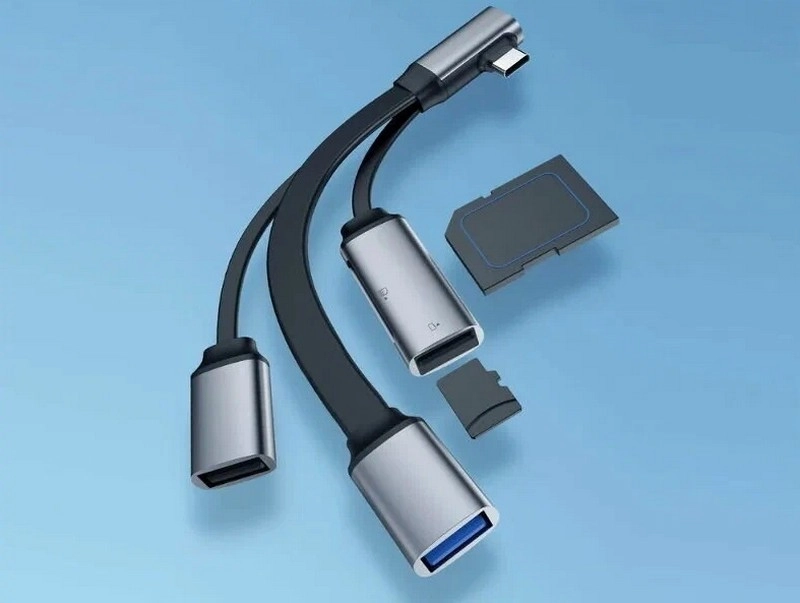Адаптер позволяет подключить мышку, клавиатуру, внешний диск, флеш-карту и другие устройства. Для этого у него есть разъемы USB-A 2.0, USB-A 3.0 и слот для SD/TF карт.