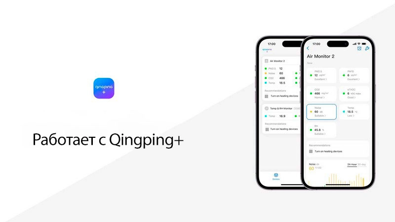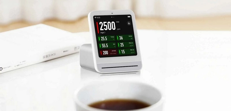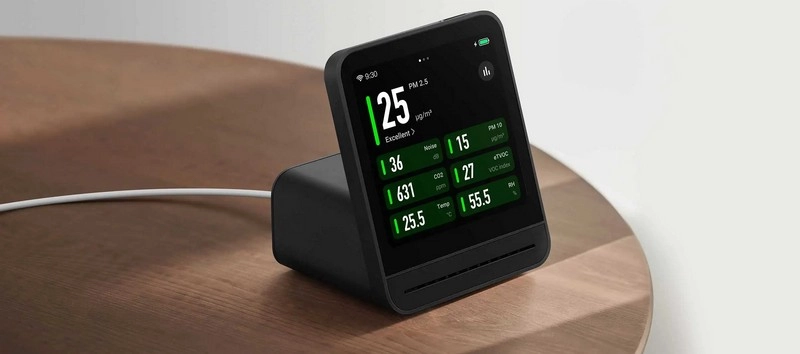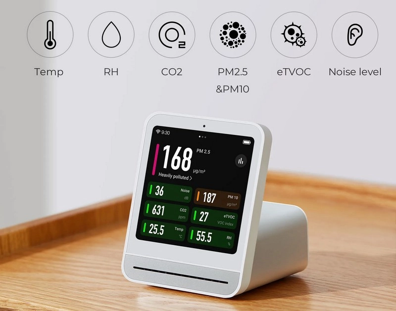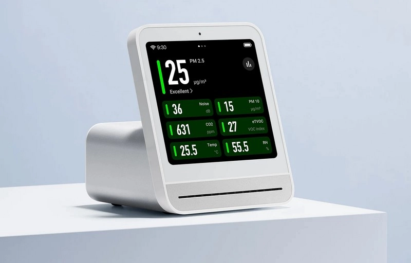 Датчик анализирует температуру и влажность воздуха, количество углекислого газа, уровень загрязнения воздуха частицами PM2.5 и PM10, еTVOC и уровень шума.