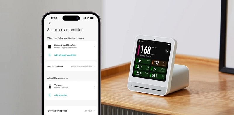 В сценариях работы умного дома можно настроить автоматический запуск очистителя воздуха при достижении определенной концентрации загрязняющих веществ в воздухе.