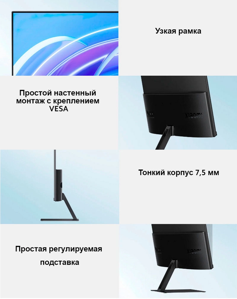 Монитор Xiaomi Display 27" A27i 100Hz (MECJ) — большой размер, высокая частота обновления и разрешение Full HD. Монитор может быть установлен на подставку или кронштейн, заводская калибровка цвета и два типа подключения.