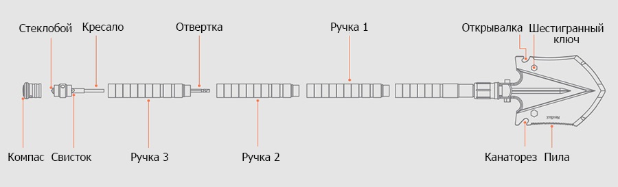 Лопата имеет множество полезных функций, которые помогут в самых разных ситуациях: стеклобой, свисток, отвертка, кресало, шестигранник, канатный нож, пила, лопата, компас и другие.