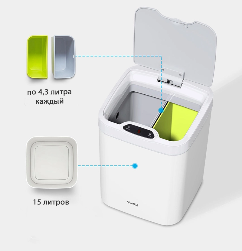 Мусорное ведро Quange GA1 Smart Sorting 15 л — умное ведро с автоматическим открыванием и возможностью раздельного сбора мусора. Корзина работает от батареек и управляется при помощи сенсорного дисплея.