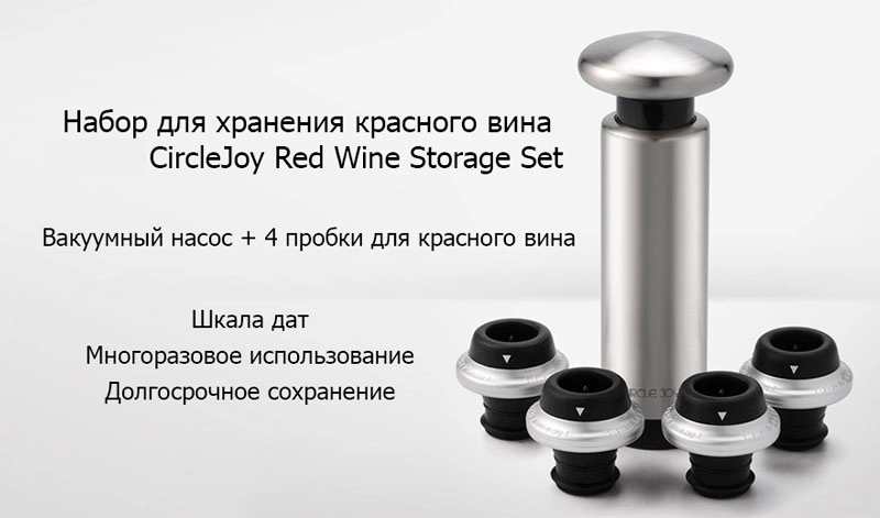 Набор для хранения вина CircleJoy Red Wine Storage Set Silver (SJ-JS05) — сохранит свежесть вина в открытой бутылке. В набор входят 4 вакуумные пробки и насос.