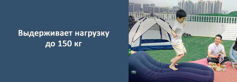 Надувная кровать выполнена из нейлона и ТПУ, это прочные влагостойкие материалы, которые выдерживают нагрузку до 150 кг. Вы можете использовать матрас на траве, песке или камнях и не переживать за его целостность.