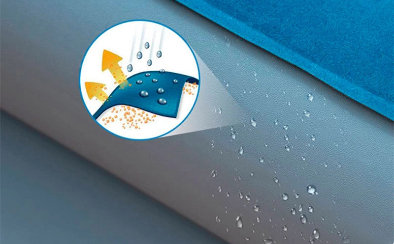 Надувная кровать выполнена из прочного ПВХ материала, который имеет флокированное покрытие. Флокирование — технология нанесения волокон ткани на какую-либо основу. Благодаря этому поверхность кровати приятная на ощупь, не скользит и отталкивает воду.