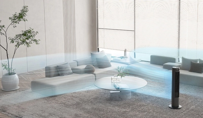 Колонный вентилятор-обогреватель может вращаться на угол от 30° до 150°. Установить подходящий угол для охвата всего помещения можно в настройках приложения.