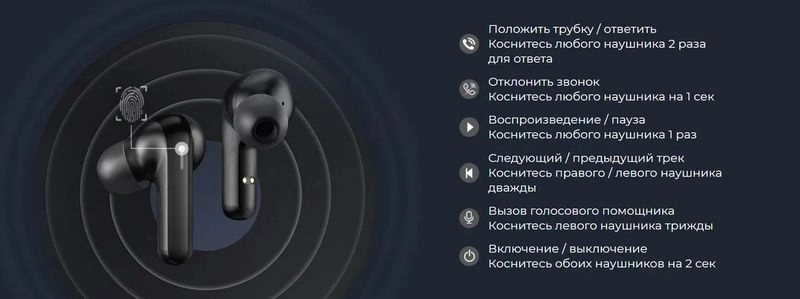 Управляйте наушниками легким движением подушечек пальцев. Переключение между треками, ответ на звонок, вызов голосового помощника и другие команды повинуются легкому движению руки.