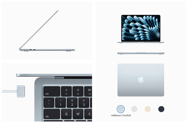 MacBook Air теперь доступен в свежем небесно-голубом цвете. Зарядный кабель MagSafe идёт в комплекте и совпадает с цветом ноутбука. Всего в линейке MacBook Air M4 представлено четыре нежных цвета: серебристый, полуночный черный, небесно-голубой и золотистый.