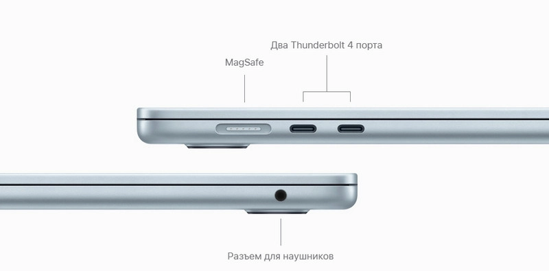 MacBook Air оснащен магнитным кабелем MagSafe для безопасной зарядки, двумя скоростными портами Thunderbolt 4 для подключения периферии и разъемом для наушников с поддержкой высокоомных моделей. Беспроводное соединение Wi-Fi 6E обеспечивает удвоенную скорость передачи данных по сравнению с Wi-Fi 6.