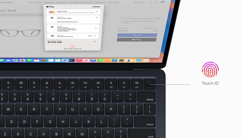 Клавиатура Magic Keyboard с подсветкой оснащена Touch ID для мгновенной разблокировки MacBook Air, безопасного входа в аккаунты и подтверждения платежей — всё это одним касанием пальца, а полноразмерные клавиши с тактильным откликом обеспечивают комфорт при работе в любых условиях.