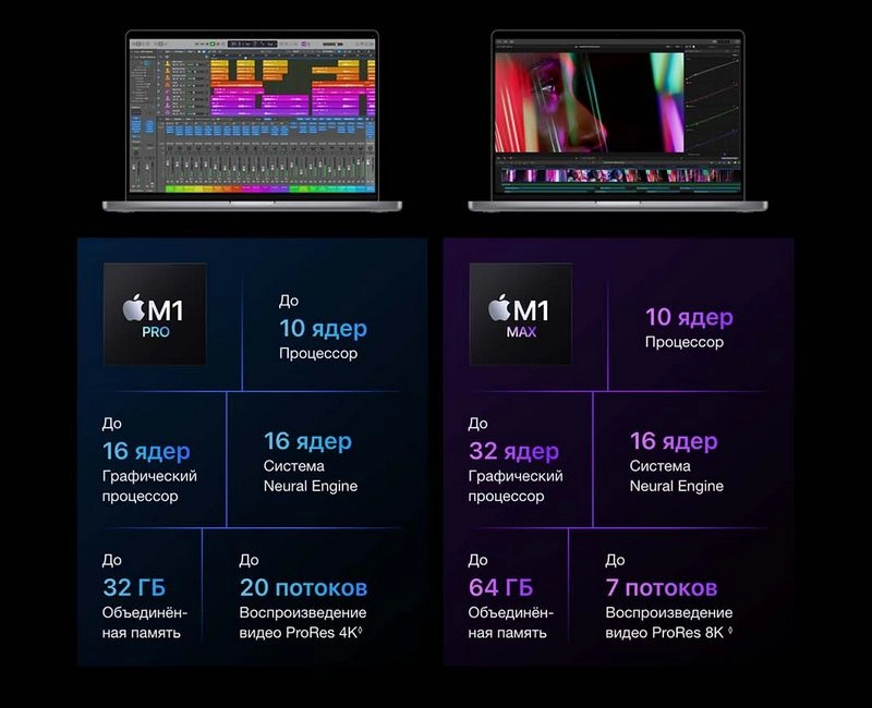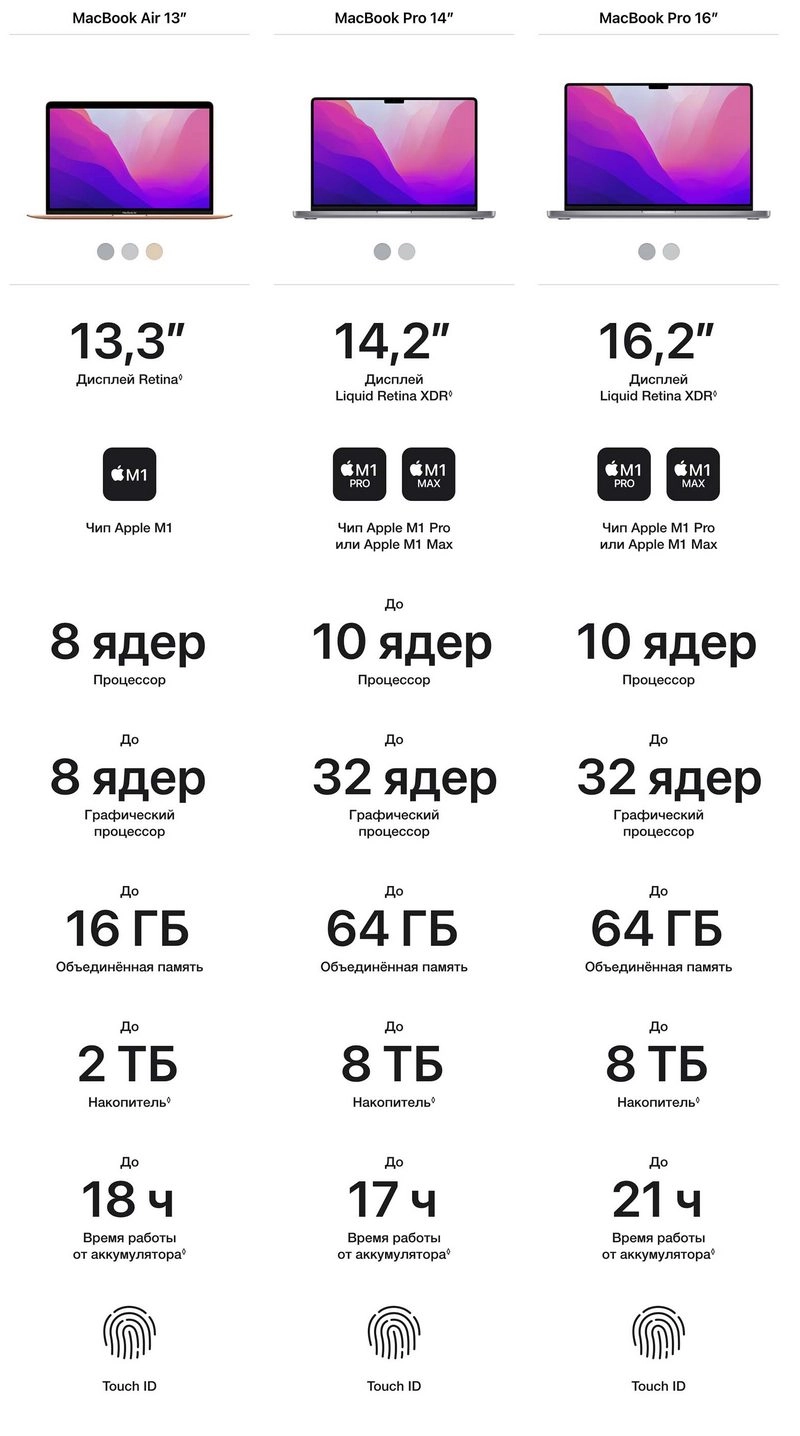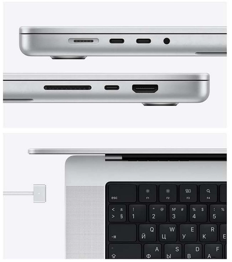 | Интерфейсы и разъемы | С левой стороны ноутбука расположены MagSafe 3, 2x USB-C (Thunderbolt 4 40 Гбит, USB 4, DisplayPort, Power Delivery), аудиоразъём. С правой стороны — картридер, USB-C (Thunderbolt 4 40 Гбит, USB 4, DisplayPort, Power Delivery), HDMI 2.0. | |