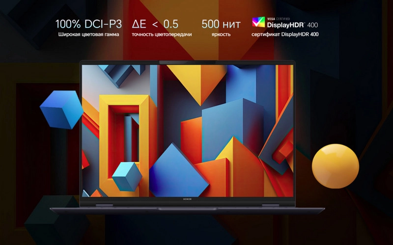 Экран HONOR MagicBook Pro 16 предлагает 16-дюймовую IPS-панель с разрешением 3072×1920 и частотой обновления 165 Гц. Цветовая гамма 100% DCI-P3 и высокая точность цветопередачи $ \Delta E<0,5 $ обеспечивают естественные оттенки, а яркость 500 нит и поддержка DisplayHDR 400 гарантируют чёткое изображение при ярком свете.