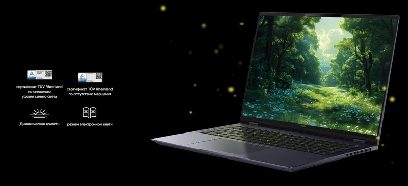 Дисплей прошел сертификацию TÜV Rheinland по снижению синего свечения и отсутствию мерцания. Режимы «Динамическая яркость» и «электронная книга» позволяют настроить комфортное изображение для длительной работы.