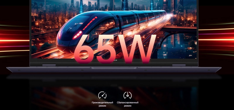 Ноутбук предлагает выбор между двумя режимами: 50 Вт для экономичной работы и 65 Вт для максимальной мощности. Переключение через Fn+P делает настройку производительности быстрой и удобной.