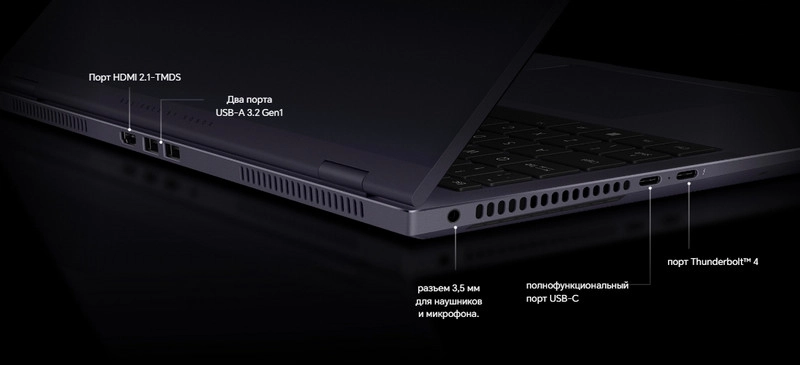 Ноутбук оснащен Thunderbolt 4, USB-C, двумя USB-A 3.2 Gen1, HDMI 2.1 и аудиоразъемом 3.5 мм, обеспечивая гибкое подключение периферии и мониторов.