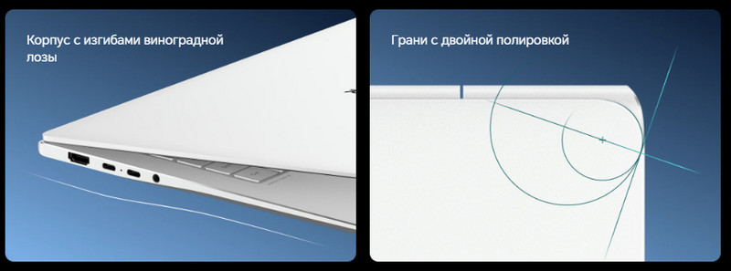 Дизайн ноутбука вдохновлён классическими формами и тонкой эстетикой. Плавные изгибы напоминают линии виноградной лозы, придавая устройству элегантность и подчёркивая его премиальный характер.