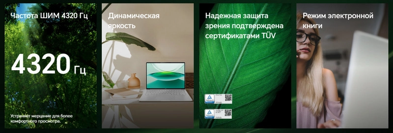 Тач-дисплей OLED 3.1K радует превосходной резкостью и сниженной нагрузкой на зрение. Технология HONOR Oasis и регулируемая ШИМ-подсветка 4320 Гц устраняют мерцание, а режим «электронной книги», адаптивная яркость и защита от синего света обеспечивают комфортную работу. Качество подтверждено сертификатом TÜV.