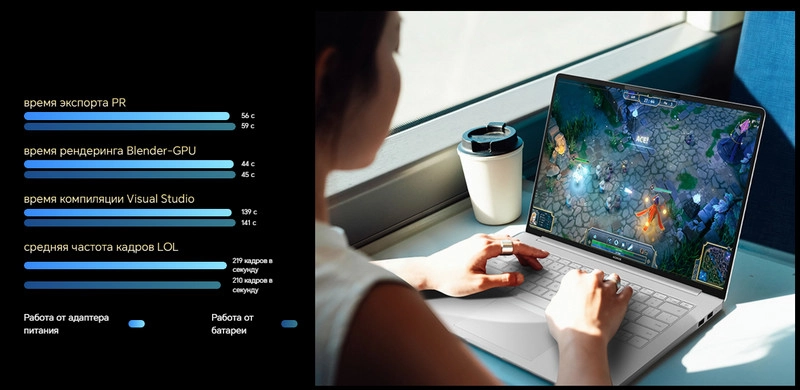 Ноутбук сохраняет одинаковый уровень производительности как от сети, так и от аккумулятора, благодаря адаптивным алгоритмам HONOR Turbo X.