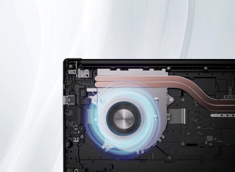Современная система охлаждения с мощным кулером, тонкими S-образными лопастями и увеличенной площадью радиатора поддерживает стабильную температуру. Две тепловые трубки большего диаметра эффективно отводят тепло, предотвращая перегрев и снижая риск троттлинга.
