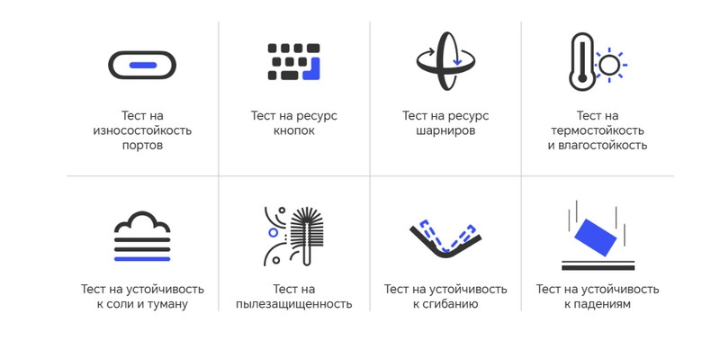 Устройство прошло обширные тесты на прочность, соответствующие отраслевым стандартам. Это гарантирует стабильную работу в разных условиях и уверенность в долговечности ноутбука.