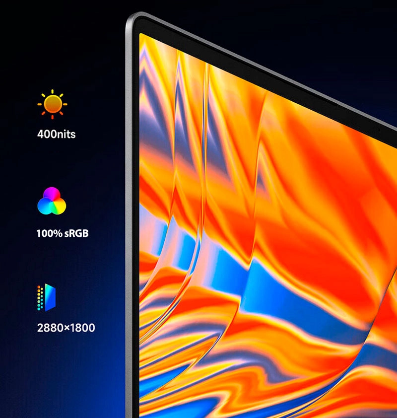 У RedmiBook 14" 2024 экран с разрешением 2880 х 1880 пикселей, 100% охватом цветового пространства sRGB, плотностью пикселей 242 PPI и ΔE=0,41. Пиковая яркость экрана достигает 400 нит.