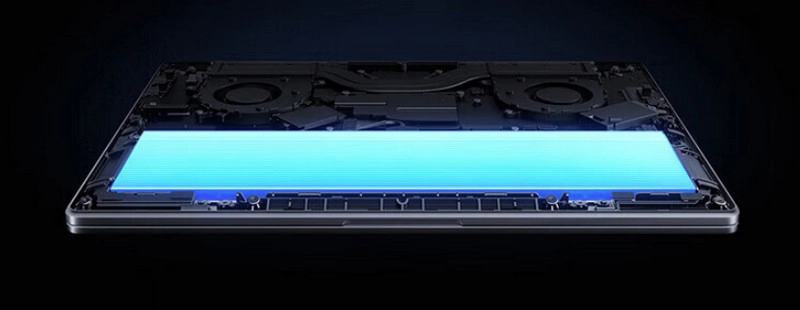 RedmiBook 14" 2024 получил систему охлаждения мощностью 65 Вт, состоящую из двух вентиляторов, двойных теплоотводящих трубок и вентиляционных отверстий, которые эффективно отводят лишнее тепло и не допускают перегрева основных компонентов.