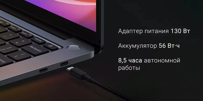 Мощный блок питания на 130 ватт зарядит аккумулятор на 50% всего за полчаса. Полностью заряженный ноутбук может проработать больше 8 часов.