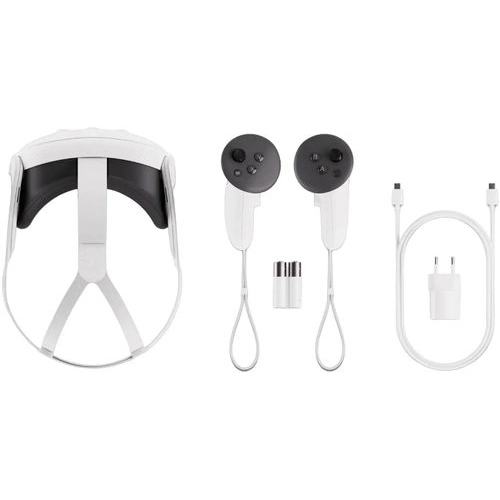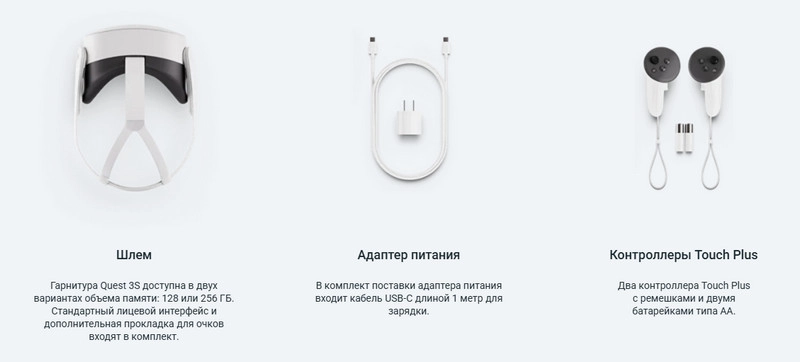 Комплектация | гарнитура Quest 3s, предустановленный стандартный лицевой интерфейс, проставка для очков (входит в комплект), 2 контроллера touch plus, 2 ремешка и 2 батарейки аа, адаптер питания, зарядный кабель | |