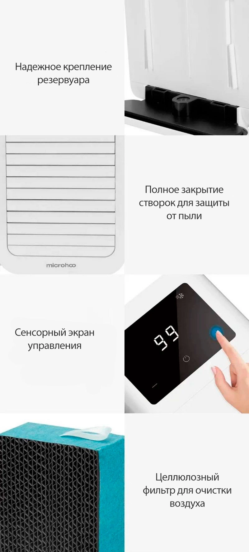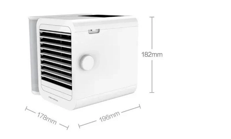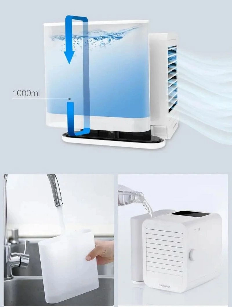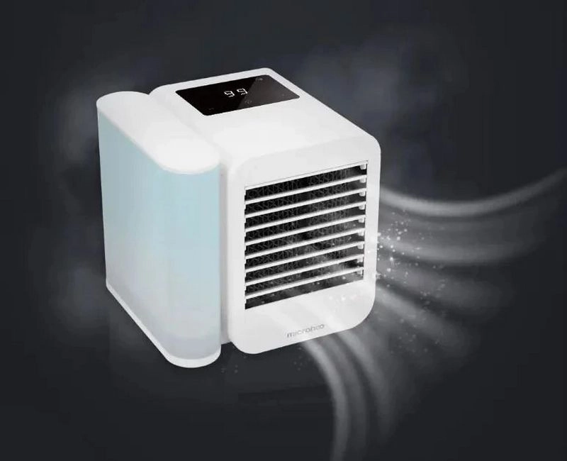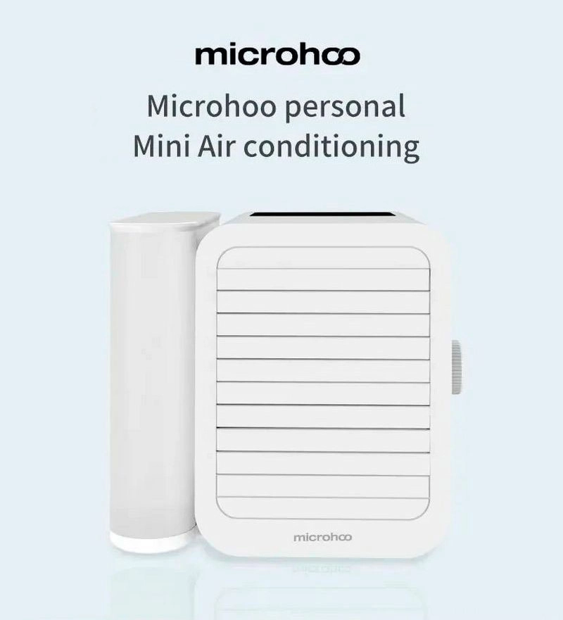 Персональный кондиционер Microhoo Personal Air Cooler (MH01R) — минимальное потребление электроэнергии и эффективное охлаждение. Представляет собой вентилятор с водяным охлаждением и целлюлозным фильтром. Небольшое устройство предназначено для персонального использования и одновременно выполняет три функции: охлаждение воздуха, его очистку и увлажнение.