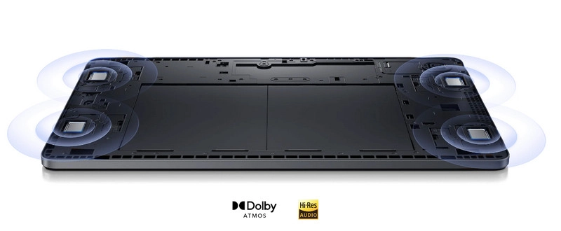 Планшет оснащен 4 динамиками по два с каждой стороны, они обеспечивают объемное звучание с поддержкой технологии Dolby Atmos.