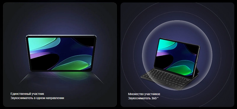 Запись звука может сосредоточиться на одном человеке или записывать групповые конференции с охватом 360°. Опция шумоподавления убирает посторонние шумы и усиливает голоса.