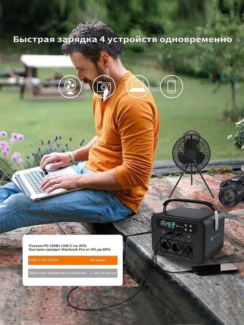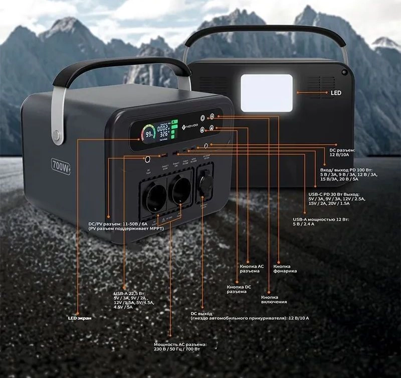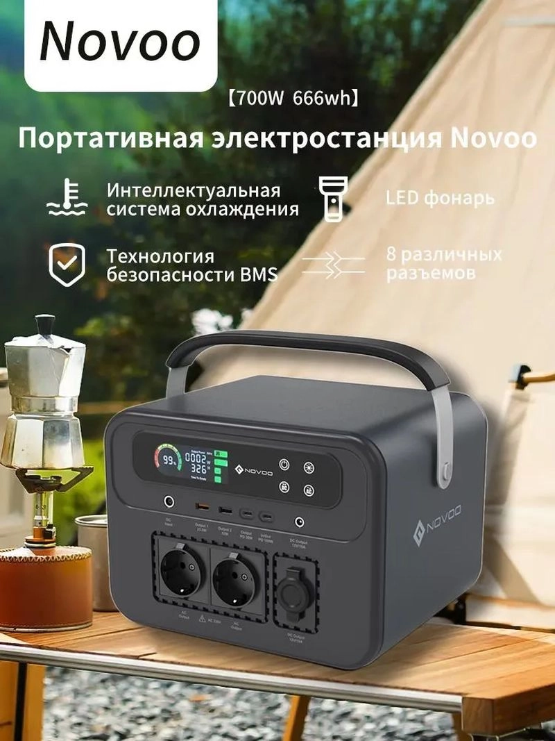 Портативная электростанция Novoo Portable Power Station 666Wh — электростанция, которая способна обеспечить электроэнергией устройства разной мощности, включая ноутбуки, мини-холодильники, авторефрижераторы и медицинское оборудование. Множество выходов делают станцию совместимой с различной техникой.