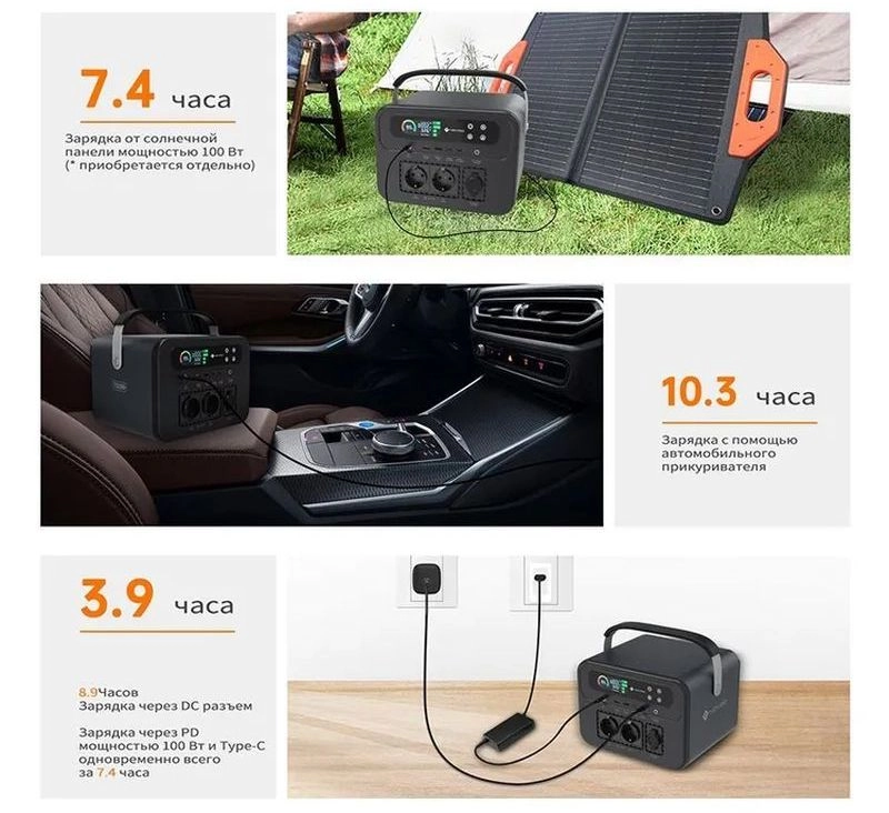 Заряжать станцию можно через обычную электросеть, зарядное гнездо автомобиля или солнечную батарею. При этом во время самозарядки станция может подзаряжать другие устройства.