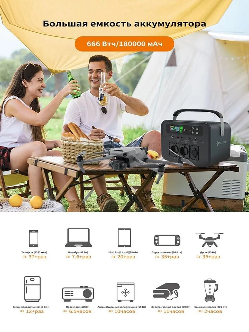 Емкости электростанции хватит на зарядку 7 ноутбуков, 20 смартфонов, 35 дронов, а также для работы автохолодильника/морозильной камеры, проектора и электро-одеяла.
