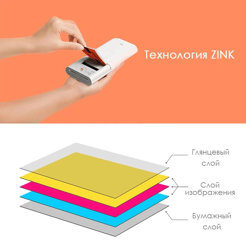 Технология бесчернильной термо-печати. Для отпечатков используется специальная многослойная бумага с цветными листами, которые активируются под воздействием тепловых импульсов определенной длины. В контейнер принтера помещается 10 листов термобумаги.