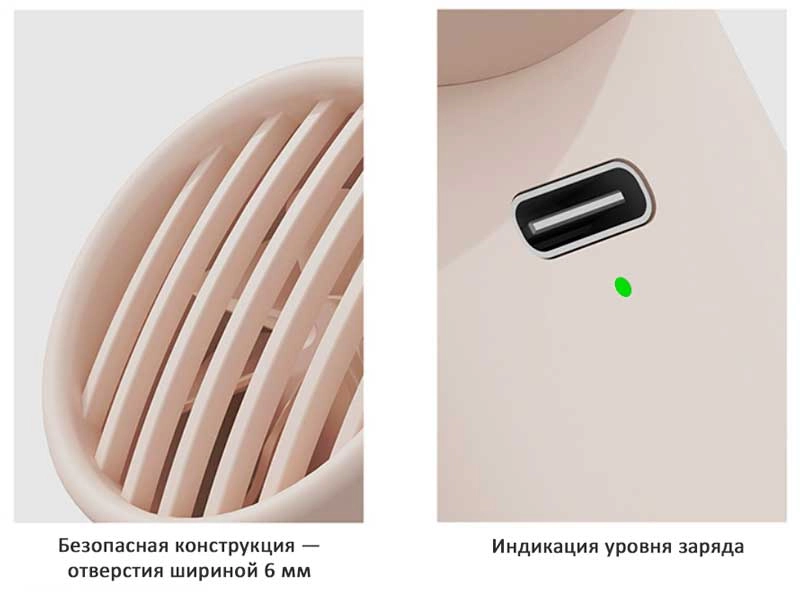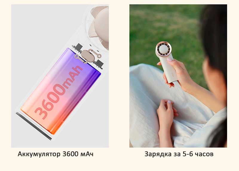 Вентилятор оснащен встроенным аккумулятором с емкостью 3600 мАч, который полностью заряжается за 5-6 часов.