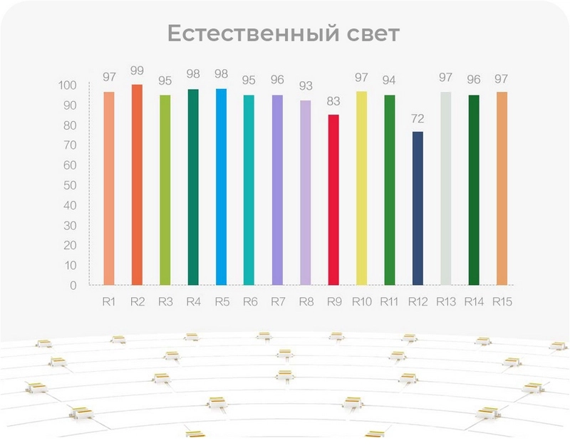 Индекс цветопередачи 95Ra максимально приближен к естественному солнечному свету. Он не искажает окружающие вас цвета и сохраняет интерьерные краски в первозданном виде.