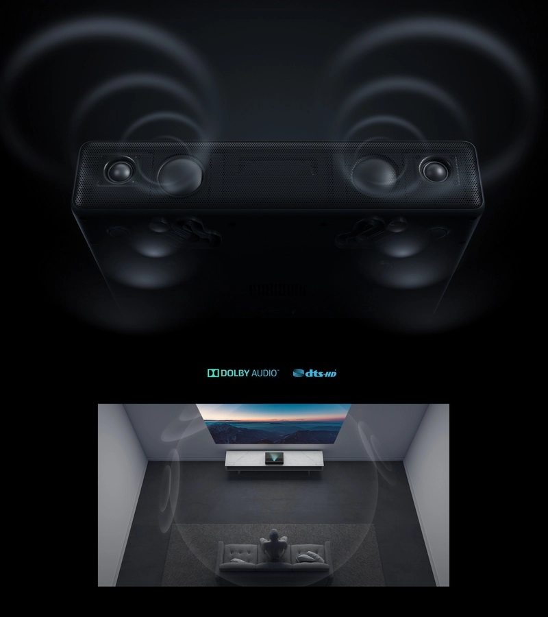 Сочетает в себе 4К-проектор и небольшой саундбар.