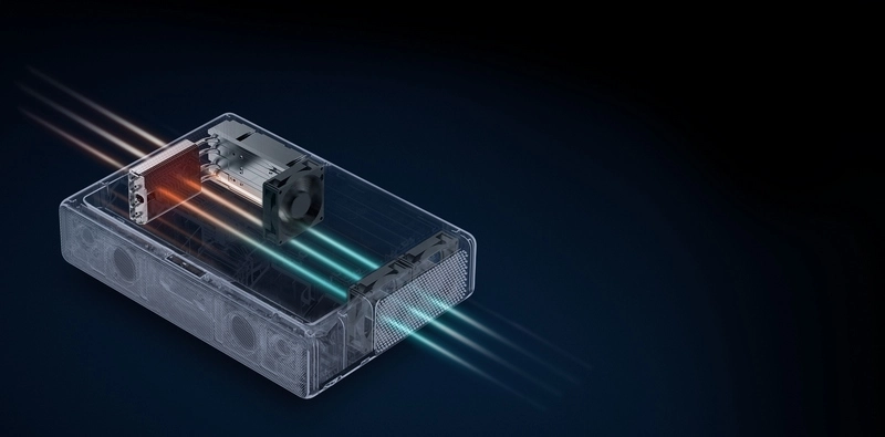 Корпус устройства оснащен тремя вентиляторами с собственной системой воздуховодов для поддержания комфортной температуры. Проектор постоянно контролирует температуру на системном уровне и автоматически регулирует мощность работы вентиляторов для бесшумной работы при ярком режиме.