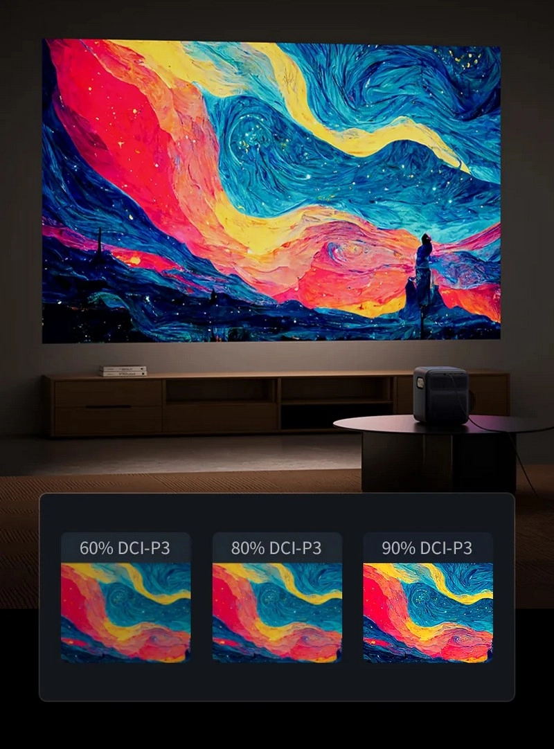 Яркость проектора Wanbo Mozart 1 Pro достигает 900 люменов, он охватывает 90% цветового пространства DCI-P3, имеет физическое разрешение 1080P и поддерживает изображение с разрешением 4K.