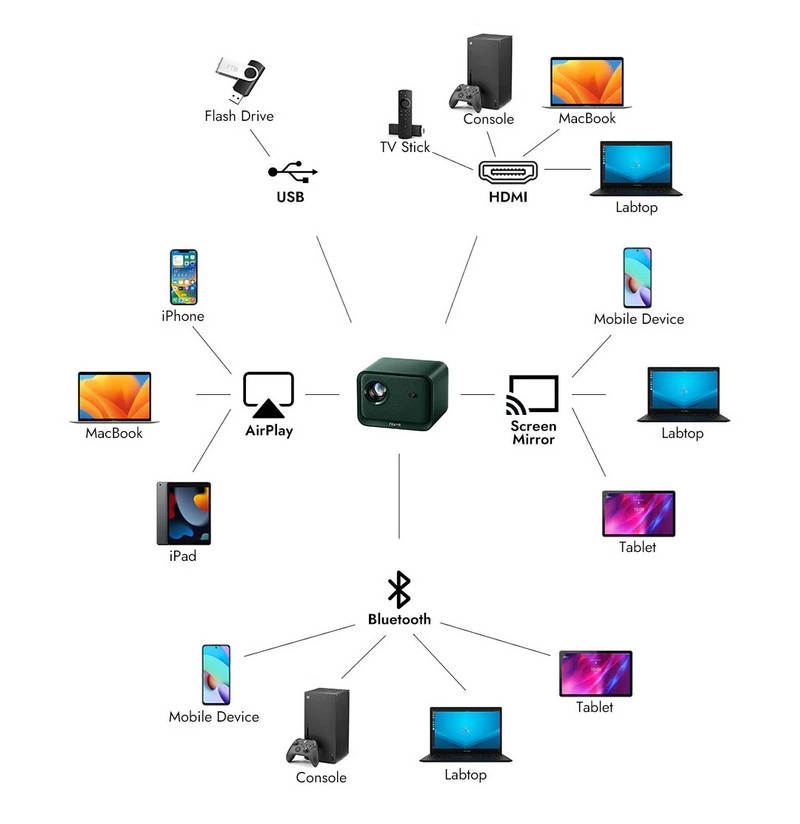 Для подключения к проектору можно использовать пять способов, это физическое подключение через HDMI и USB, а также беспроводные варианты: Bluetooth, Screen Mirror и Air Play.