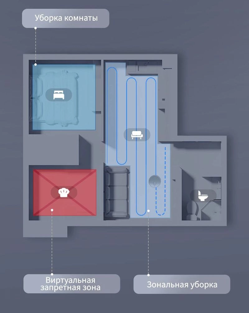 В приложении Dreame можно настроить режим работы, выбрать комнату для уборки, задать расписание или поставить виртуальные стены для ковров, мисок животных и др.