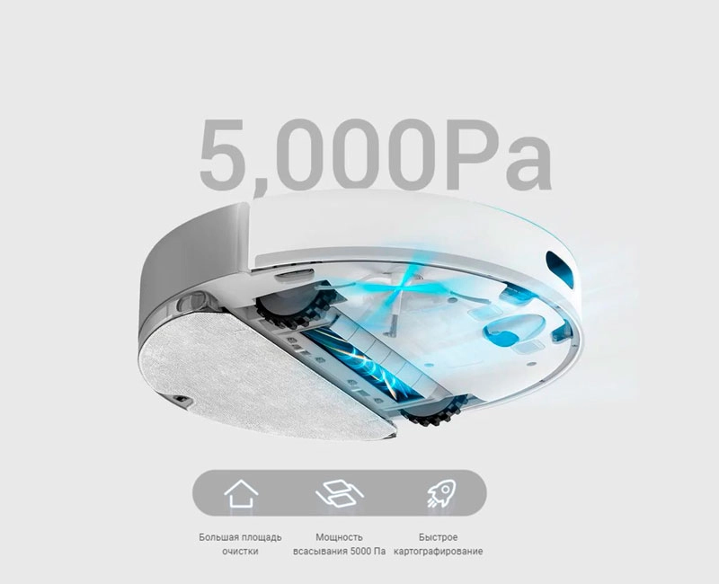 Встроенный аккумулятор емкостью 5200 мАч позволяет роботу убирать на протяжении 150 минут без подзарядки. Этого времени ему хватает на уборку 250 кв.м. площади.